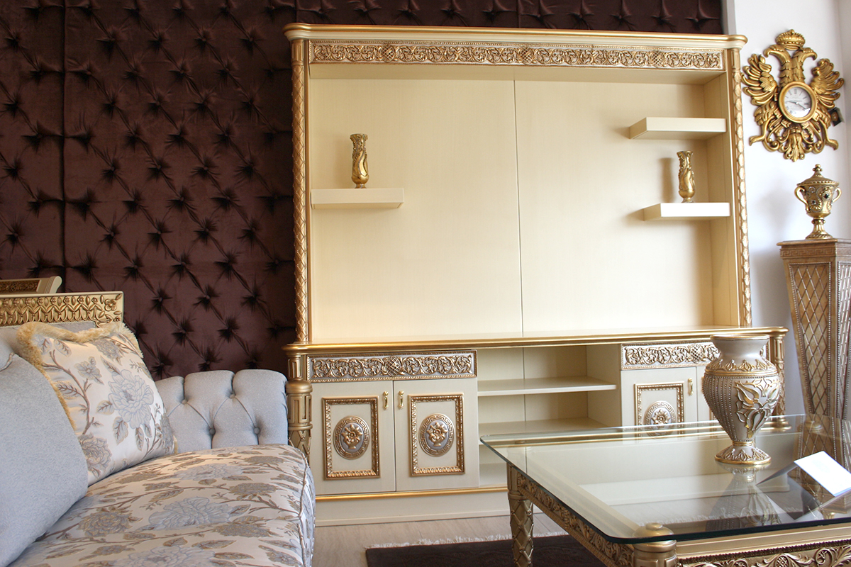 In the luxury wall unit model produced for the Artemis group, classical carving art was applied with hand workmanship and delicate motifs were revealed. The motifs that each motif supports with each other with fine details will create harmony with your new generation televisions. The wall unit with its unique carving motifs, combined with the Artemis living room sets in living spaces, offers you the opportunity to have the desired concept easily. The wall unit stands out not only with its stylish design, but also with its functionality and reminds you of the importance of functionality. In the wall unit, which has a two-storey shelf and four door cabinets, gold leaf application on antique cream color was produced, and hinges with special brake suspension against bumps were used in their doors to prevent possible accidents and wear. The design inside the wall unit can be designed from the beginning as you wish, so you can easily reach the wall unit of your dreams. Asortie classic wall unit models can also be produced individually with a wide color scale and wide size options in line with your wishes. With the architectural service provided by Asortie Furniture, it will be easier to obtain a luxurious lounge and living room with classic lines that adorns your dreams. Now you can contact us via the product information form or the whatsapp contact line and get the opportunity to review our products.