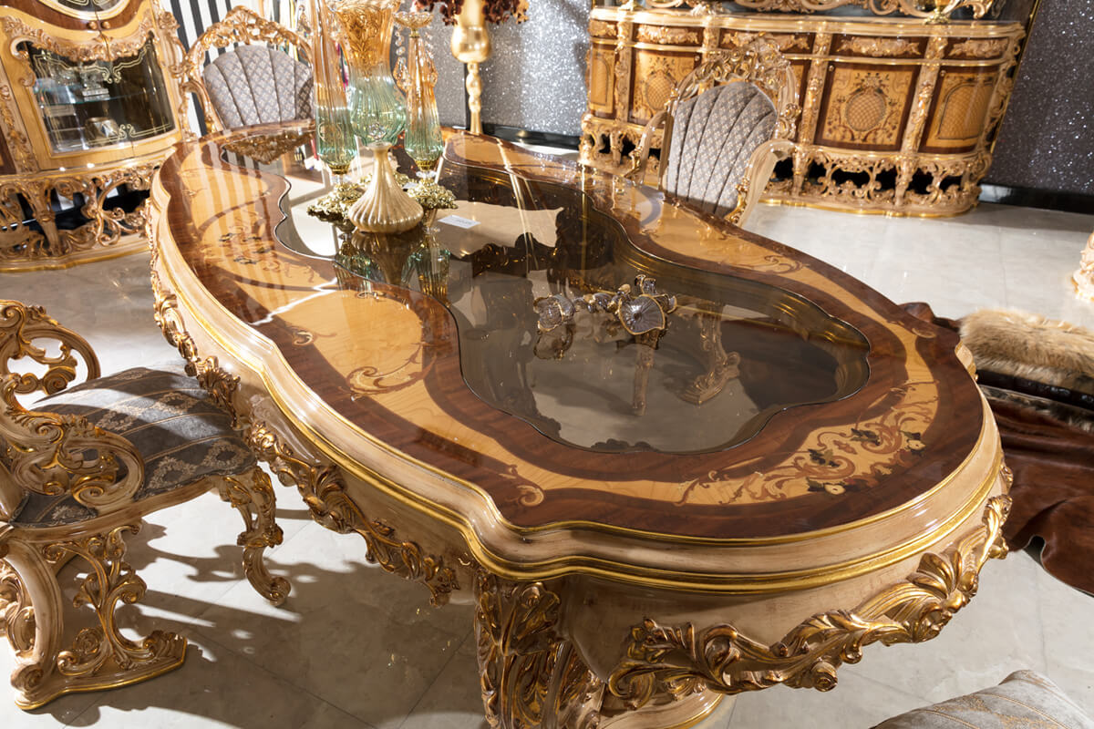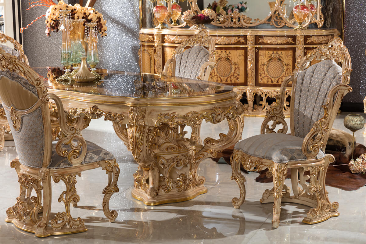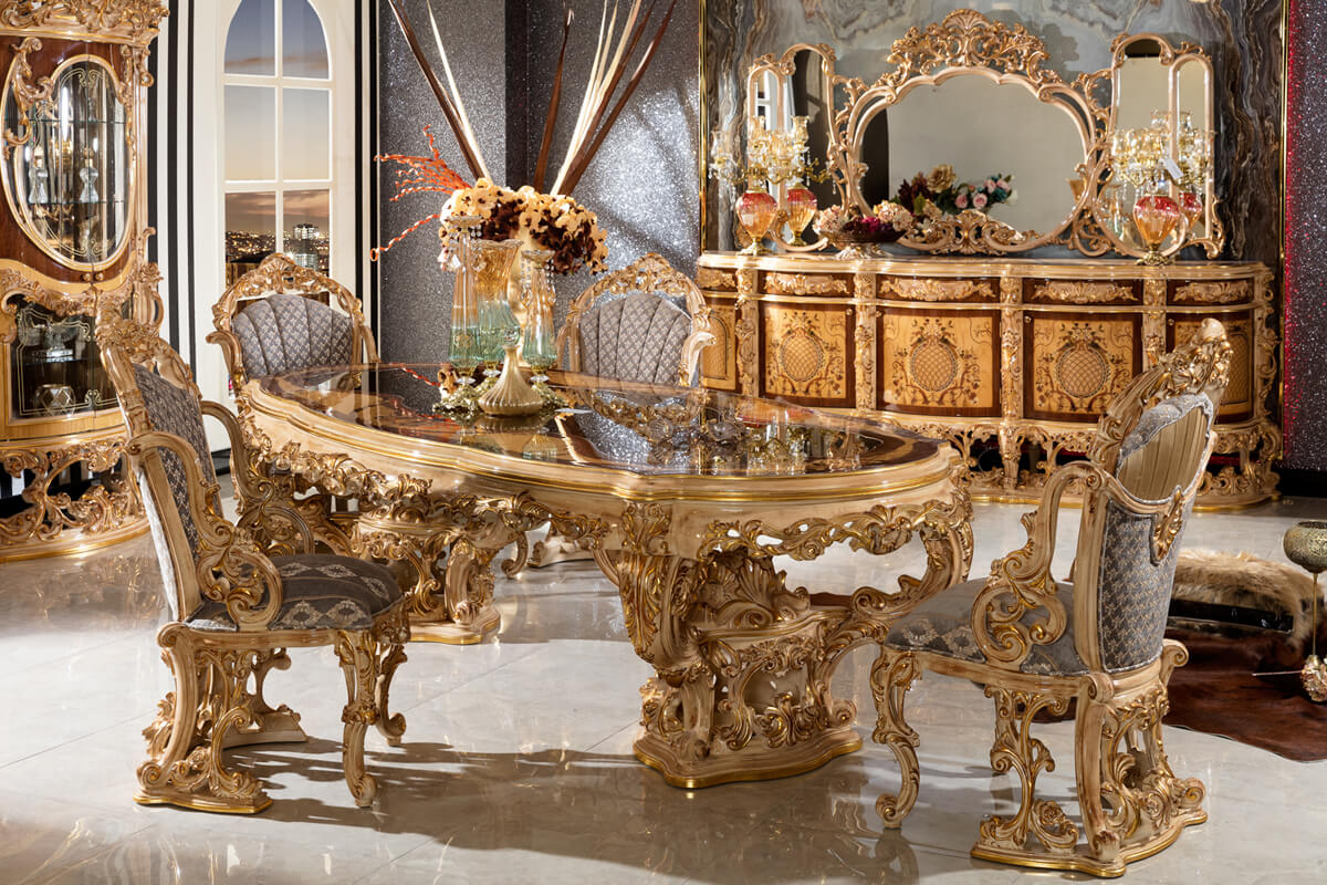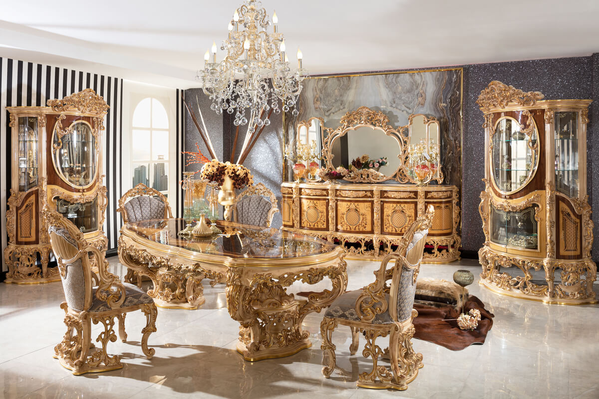 Ekselans classic dining room set, with its intensive wood carving craftsmanship and real gold plated craftsmanship, is appreciated by all viewers. The classic dining room set consists of a luxury dining table, wooden console, classic showcase and 6 dining table chairs designed with ergonomic forms in mind. Optionally, luxury accessory models and classic chandelier types can also be included in the team in order to fully adapt to luxury living spaces and complete the team’s eye-catching elegance. The luxurious dining room set can be reproduced depending on the wishes of the users with special size and color options to fully adapt to the preferred area. The users who prefer the Ekselans classic dining room set in their living spaces also buy the Ekselans classic sofa set from the group’s own group in order to achieve the perfect harmony.