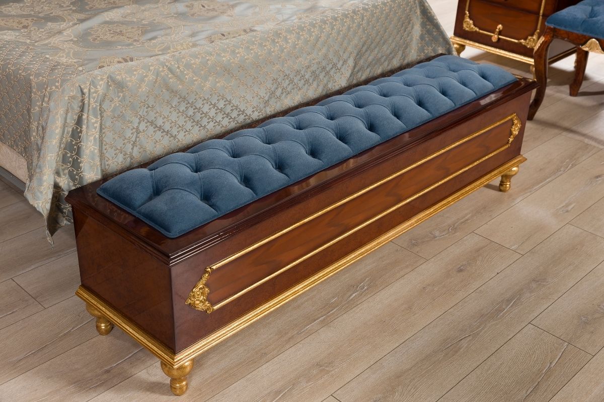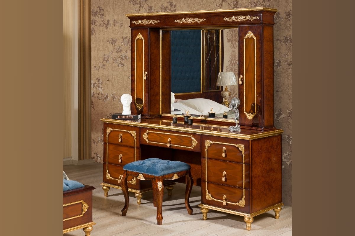 This is the most splendid model of Asortie’s new season classic bedrooms collection and it is produced by handmade natural wood, the bedroom set gives a rich style to living spaces with its majestic and elegant design. The gold leaf carving motifs on the walnut floor gave a sleek elegance to the classic bedroom design. The bed-head carvings, which were designed as wall panels in the back of the Bedlam and the bedside tables, were prepared with handmade craftsmanship from Linden Wood. The carved motif in the bed head is designed as a complete quilting, stands out as the most striking part of the bedroom team. On the Komodins, a glass of baklava was made and the space was tried to give a fresh atmosphere. Luxury and stain-repellating fabrics were preferred in the cot head. The side of the vanity mirror on the dressing table is designed as a cover cabinet for you to put your small perfumery, jewelry and care materials.